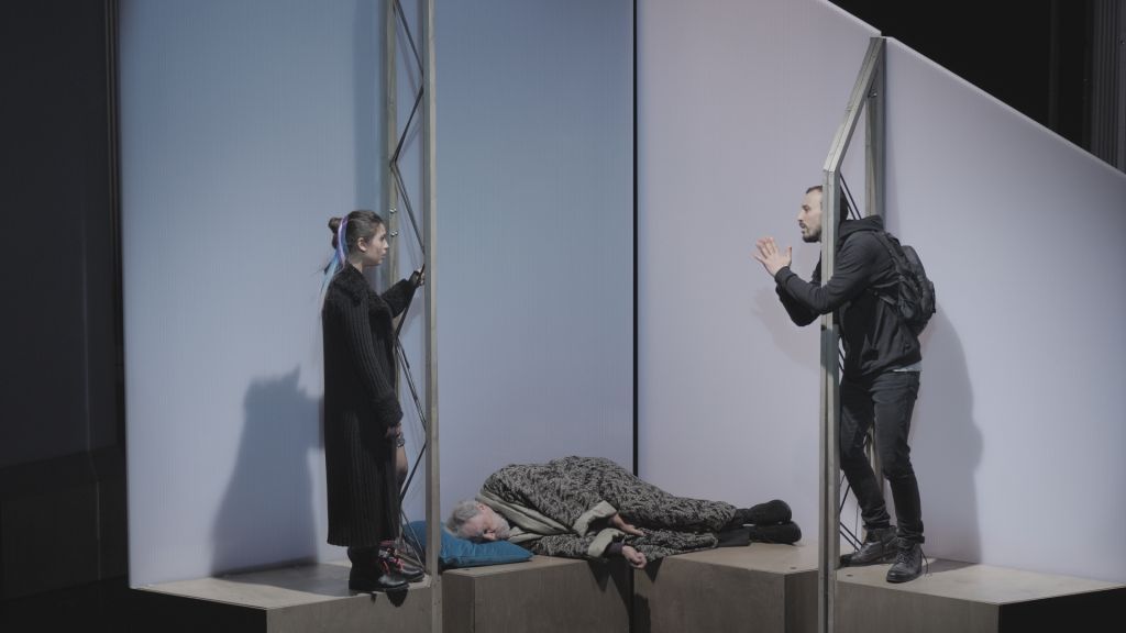 Les personnages évoluent dans une sorte de no man’s land fait de panneaux de plastique tantôt translucides pour laisser voir ce qui se passe derrière, tantôt opaques sur lesquels volètent ou se posent des oiseaux, sur lesquels ondulent en ombre chinoise des femmes à tête de serpent, ou qui matérialisent la massivité des coffres-forts. Ils suffisent, en l’absence de tout élément de mobilier, à définir une chambre, à offrir une banquette où conversent les personnages, à matérialiser le lit d’un malade. On est à l’ère de l’électrique, avec micros HF et publicités au néon, même si le père malade qui se fait dans la pièce le porte-parole du credo hugolien d’un monde menacé de disparition, semble par un anachronisme assumé appartenir à un autre âge dans sa robe de chambre chamarrée.